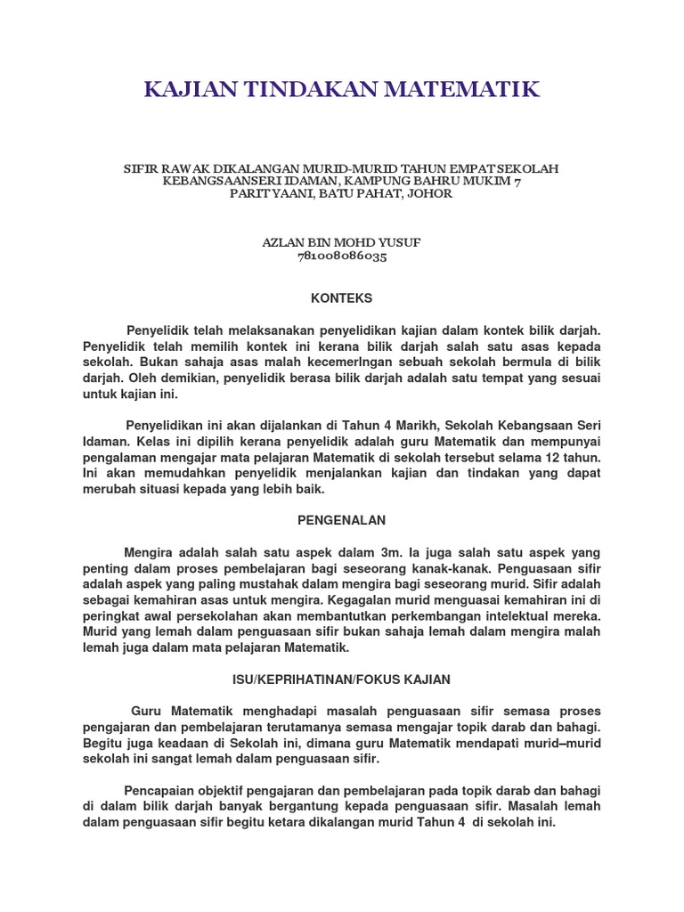 08a Konsep Dan Tujuan Pemulihan Matematik from imgv2-2-f.scribdassets.com Instrumen yang digunakan semasa menjalankan kajian ini ialah soal selidik berdasarkan kepada empat Fakulti pendidikan universiti teknologi malaysia Kajian ini bertujuan mengkaji masalah pembelajaran matematik dalam bahasa inggeris di kalangan pelajar tingkatan 2 sekolah luar bandar. Kajian tentang ppik dalam kalangan guru sekolah, sama ada rendah atau menengah, masih terlalu sedikit, khususnya dalam pendidikan matematik. Sampel kajian ini terdiri daripada dua orang murid lelaki yang berumur 14 tahun dari program pendidikan khas integrasi (masalah pembelajaran) di salah sebuah sekolah di lembah kelang. Doc kajian tindakan terbaru rosidawati abdullah academia edu. Pengajaran dan pembelajaran matematik tahun lima. 5.5.3 proses pengajaran dan pembelajaran 239 5.5.4 cadangan kepada pihak berkepentingan 242 5.5.5 cadangan kajian lanjutan 243 5.6 penutup 244 rujukan 245 lampiran a sumber masalah, cadangan perubahan dan tindakan lampiran b masalah matematik yang perlu diselesaikan lampiran c panduan menulis soal selidik reflektif